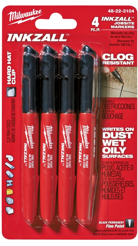 Inkzall™ jobsite markers feature clog-resistant tips and the ability to write through dusty, wet or oily surfaces. The durable marker tips are designed for writing on rough surfaces such as OSB, cinder block and concrete and the ink dries quickly to reduce smearing markings, without drying out quickly when the cap is left off. For added user convenience, the Inkzall™ markers have a built-in hard hat clip for easy storage and access. Inkzall™ markers confirm to Milwaukee's commitment to best-in-class durability and their relentless mission to provide innovative solutions to the end user.