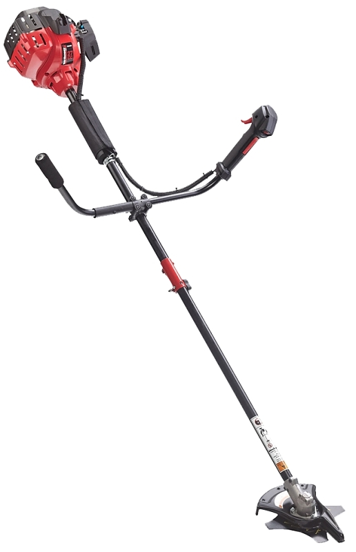 The straight brush cutter/trimmer features a 27 cc two-cycle engine it also has a four-sided reversible brush blade and adjustable bull-horn handles. Trims more than just grass.