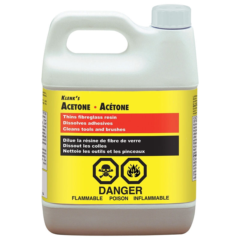 Klenk's acetone thins fiberglass resins. It dissolve adhesives and cleans tools and brushes.