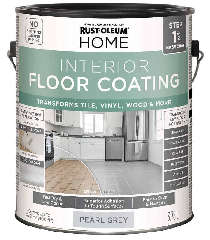 Rust-Oleum® home base coat is step 1 of 2 of this extremely durable interior floor coating system. This easy-to-use system can transform the look of any outdated floor without the cost of replacing it. The base coat brings a variety of color options you can choose from to refresh your space just by painting your floor. It can be used on tile, wood, laminate, concrete, vinyl, linoleum and more. Apply the base coat in your desired color and then apply the required top coat in one of two sheens.